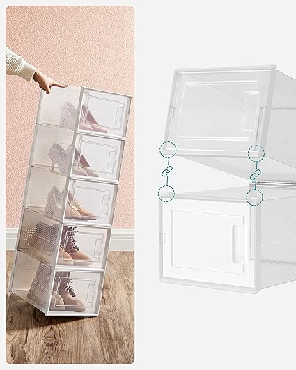 [İstif veya Yan Yığın] Alt kısımdaki oluk tasarımı, ayakkabı kutularını yerleştirmeyi kolaylaştırır – kule yapmak için istifleyebilir veya yan yana yerleştirebilirsiniz; ayrıca havalandırma delikleri ile ayakkabılar kokuları önlemek için nefes alabilir