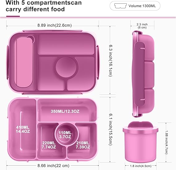 İyi Porsiyon Boyutları:Boyut 22,6 cm x 16 cm x 6 cm,1300 Ml’lik Mükemmel Tasarım, Çocuklar İçin Bento Öğle Yemeği Kutusunu Büyük Kapasiteli ve Hafif Yapar ,5 Bölmeli Bento Kutusu Yetişkin Öğle Yemeği Kutusu,Öğle Yemeğinizi Daha Besleyici ve Dengeli Hale Getiren Öğle Yemeğinizde Daha Fazla Çeşitlilik Paketlemenizi Teşvik Eder