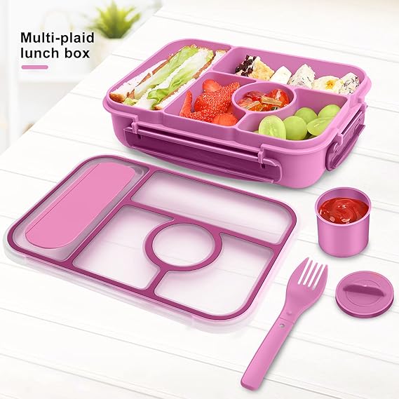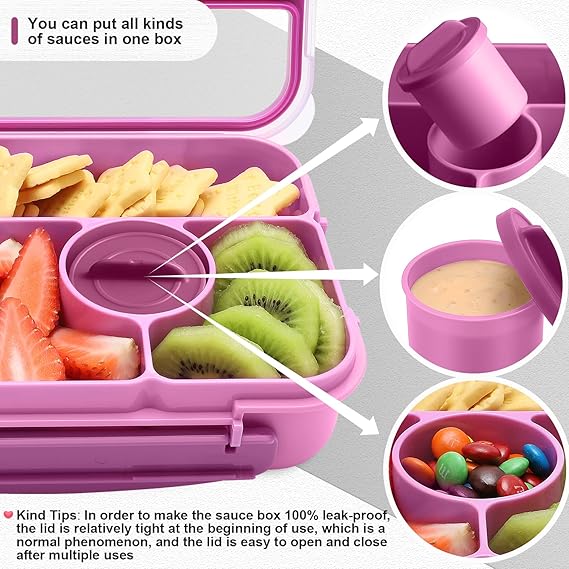 Lunch Box for Kids,Bento Box çocuk beslenme kutusu,Yetişkin Öğle Yemeği Kutusu,1300ML-5 Bölmeli Sosluklu ve Çatal Bıçaklı Öğle yemeği kapları,Mikrodalga Bulaşık Makinesi (Mor)