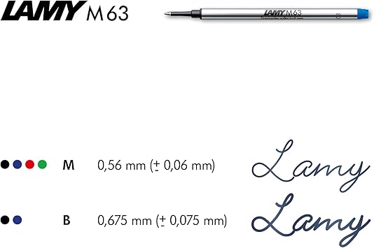 Roller Lamy M 63 tükenmez kalem ucu ile donatılmıştır, farklı varyasyonlarda ve modellerde mevcuttur: Siyah, mavi, kırmızı, yeşil, M ve B çizgi genişliklerinde mevcuttur