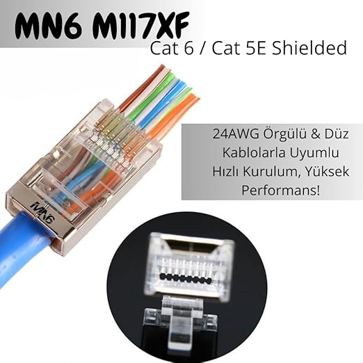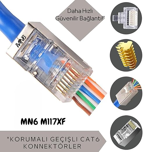 MN6 M117XF CAT6 METAL EZ PLUG – KALİTELİ, DAYANIKLI VE KOLAY KULLANIMLI RJ45 KONNEKTÖR Yeni nesil MN6 M117XF CAT6 METAL EZ PLUG, ağ bağlantılarınızı daha sağlam ve verimli hale getiren üstün özelliklere sahiptir. Piyasadaki rakiplerine kıyasla daha fazla dayanıklılık, kolay montaj ve yüksek iletkenlik sunarak öne çıkar.