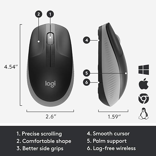 M190 kablosuz fare, iki elle kullanım için kavisli tasarım, 18 ay pil ömrü artı güç tasarrufu modu, USB alıcısı, geniş tekerlek ve tuşlar sayesinde hassas kontrol, gri