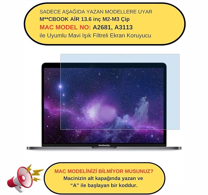 M2 M3 M4 GOZ KONFORU: MacBook Air 13.6 inç M2 M3 ve M4 modeller için geliştirilen Anti BlueRay kaplama, mavi ve mor ışığı filtreleyerek uzun kullanımda göz yorgunluğunu azaltmaya yardımcı olur.
