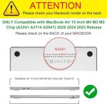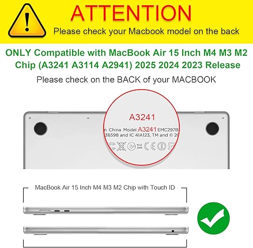MacBook Air M4/M3/M2 15″ (2025-2023) A3241 A3114 A2941 ile uyumlu özel olarak tasarlanmıştır. Diğer modellerle uyumlu değildir. Lütfen satın almadan önce dizüstü bilgisayarın arka tarafındaki model numarasını kontrol edin.