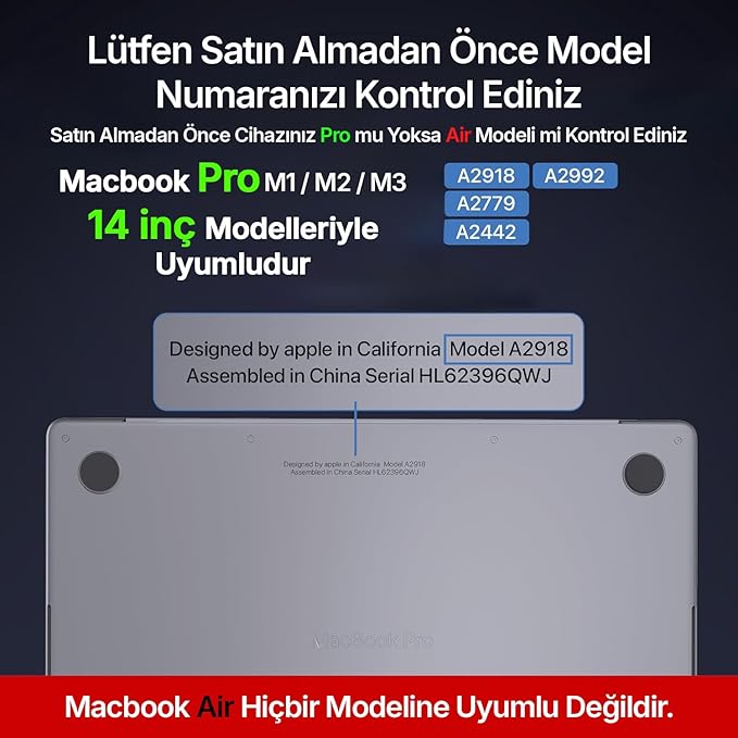 2024-2023-2022-2021 Yıllarında çıkan Macbook Pro 14 inç M1/M1 PRO/MAX/M2/M3/M4 Çipli (A2992) (A2918) (A2779) (A2442) (A3112/A3185/A3401) Model Numaralarına Uyumludur.