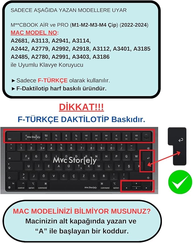MacBook Türkçe F Klavye Koruyucu – Eski F Dizayn Baskılı Silikon, ISO (Ters L Enter) Uyumlu, Ultra İnce, MacBook Air 13,6/15,3 ve MacBook Pro 14,2/16,2 M-Serisi Siyah