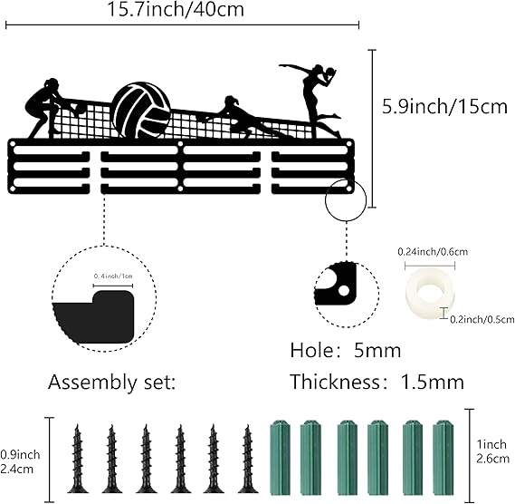 Madalya askısı boyutu: 1 x madalya tutucu, elbise askısı: 40 x 15 cm (15,7 x 5,9 inç), delik: 0,2 inç (5 mm), 1 adet kutulu, 6 adet çivi ve genişletme borusu. (Beyaz conta, duvar ile madalya kancası arasındaki mesafeyi korumak için kullanılır, madalyaların asılmasını kolaylaştırır)