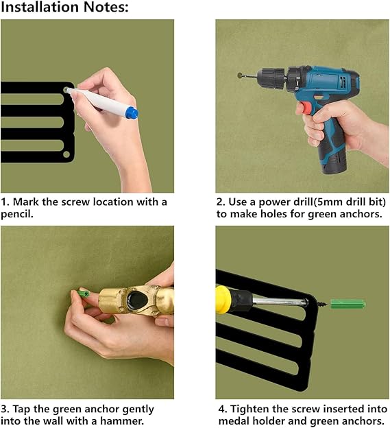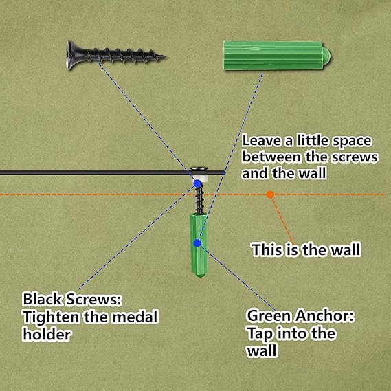 Kolay kurulum: ① Vida pozisyonlarını bir kurşun kalemle işaretleyin. ② Duvar ankrajı için delik açmak için bir matkap (5 mm matkap) kullanın. ③ Duvar ankrajını hafifçe duvara vurun. ④ Kancayı takın ve vidaları sıkın. (Not: Madalyanın asılmasını kolaylaştırmak için madalya kancasının duvara yapışmasını önlemek için lütfen dübel ve vida arasındaki mesafeyi koruyun)