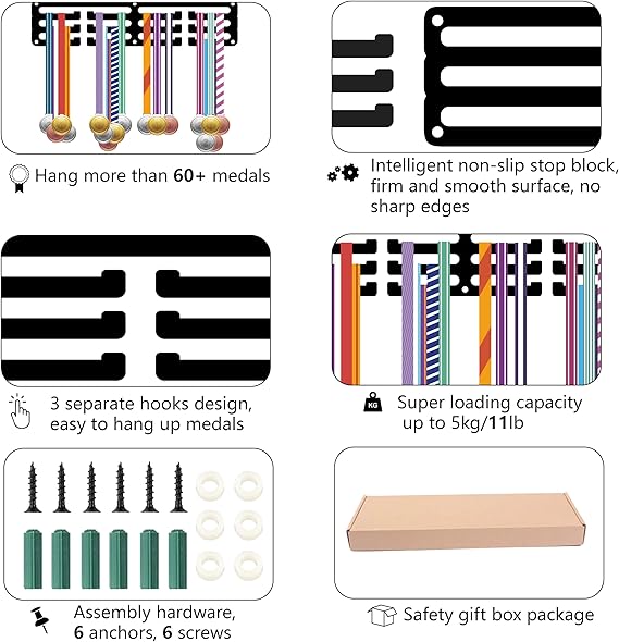 60’dan fazla madalya taşıyın: Madalya tutucu yüksek kaliteli demirden, 3 sıra ve 12 ayrı tutucudan oluşur, 5 kg/11 lb’ye kadar süper yük kapasitesi, 60’tan fazla madalya asılabilir, akıllı kaymaz durdurucu bloğu, sağlam ve pürüzsüz yüzey, keskin kenarlar yoktur.