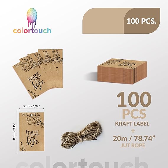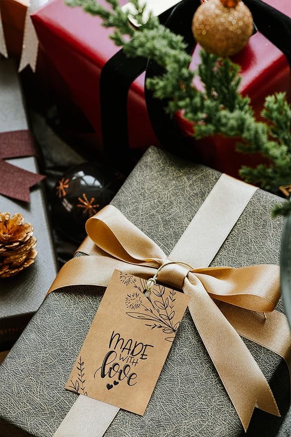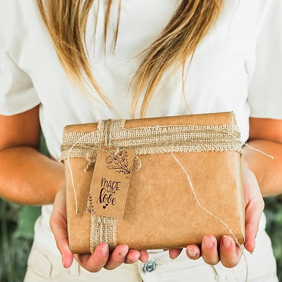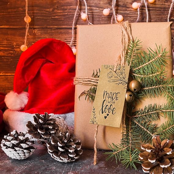 Made With Love Kraft Paketleme Etiketleri – 100 Adet Kraft Etiket Jut İple Birlikte – 5 * 8 cm Ölçülerinde Dikdörtgen Formunda
