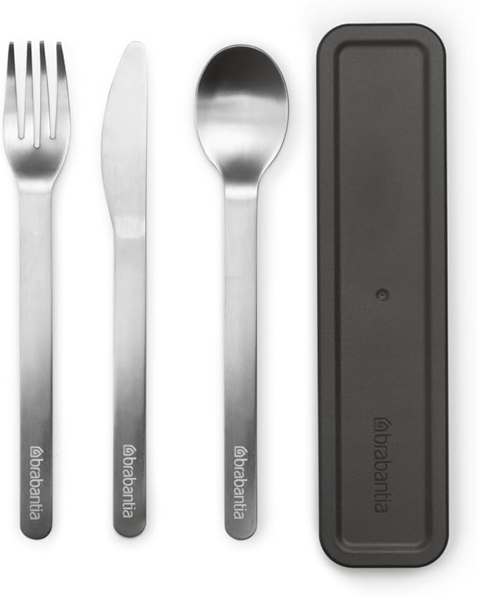 Komple çatal bıçak seti – Brabantia çatal bıçak seti, temiz bir şekilde saklamak ve rahatça taşımak için plastik bir kılıfa yerleştirilmiş bıçak, çatal ve kaşıktan oluşur