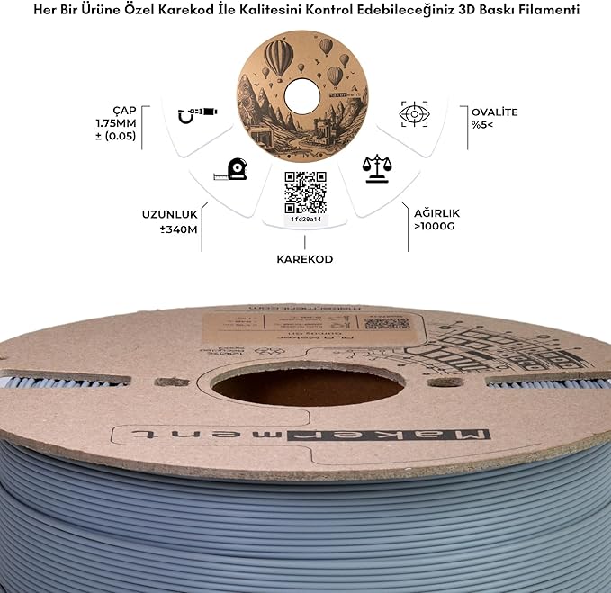 Makerment, sıkı bir şekilde kontrol edilen +/- 0,05 mm tolerans dahilinde filament çap ölçü hassasiyetini garanti eder.