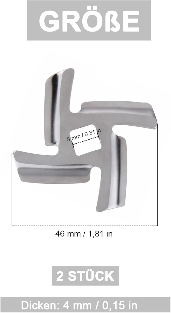 Kıyma makinesi plakası bıçak boyutu: 46 mm x 46 mm, orta delik ölçüsü: 8 mm x 8 mm, kalınlık 4 mm, birçok kıyma makinesi için uygundur, lütfen sipariş vermeden önce boyutu kontrol edin.
