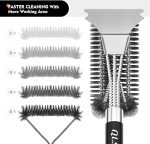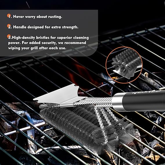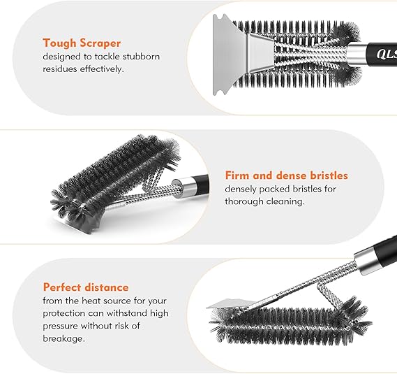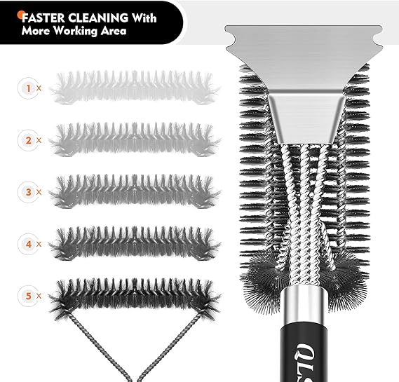 Verimli temizlik: BBQ hayranları için üretilmiştir! Izgara fırçalarımız üç sıralı paslanmaz çelik kıllara sahiptir, fırça kılları diğer geleneksel fırçalardan üç kat daha iyidir, temizleme etkisi daha iyidir. Zor ulaşılan yerlerde bile yağ ve yanmış gıda artıklarını etkili bir şekilde giderir.