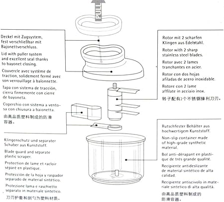 Doğrayıcı çalışırken, güvenle kabı kapatabilmek için kapama süngüsüne sahiptir. 2 boyda çalışan 2 keskin paslanmaz çelik bıçak, güvenilir sonuç sağlar.