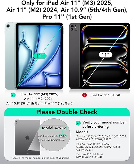 Uyumluluk: Sadece iPad Air 11 inç M2, iPad Air 6./5./4 için. nesil (2024/2022/2020) 10,9 inç ve iPad Pro 11 inç (1. nesil, 2018) modeller: A2902, A2903, A2588, A2589, A2591, A2316, A2324, A2325, A2072, A1980, A2013, A1934