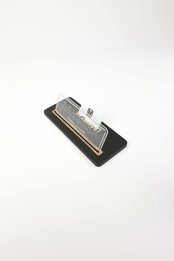 Modern ve minimalist tasarım, yüksek kaliteli deri malzeme, yüksek teknoloji sayesinde, kusursuz çözünürlüklü lazer kazıma ve tamamen profesyonel el işçiliği ile kişiye özel hazırlanan Siyah Deri Masaüstü İsimlik ve Kartvizitlik, Gold detaylıdır, siyah, beyaz veya şeffaf pleksi ve 10 farklı font seçeneği ile üretilebilir ve özelleştirilebilir niteliktedir.