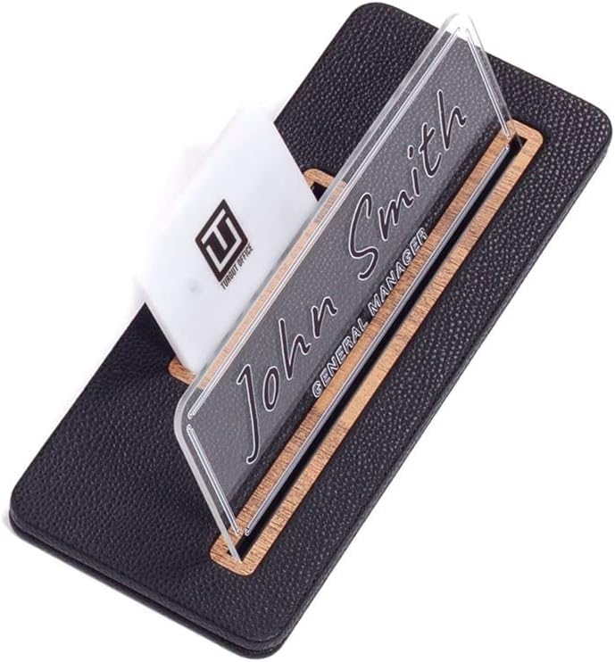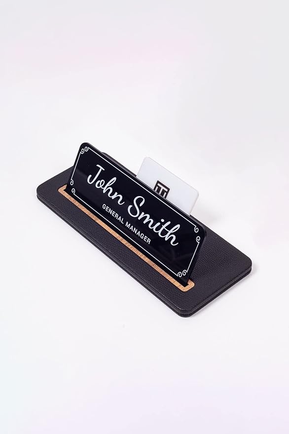 Siyah Deri Masaüstü İsimlik ve Kartvizitlik: Kişiye özel Ahşap detaylarla süslenmiş Siyah Deri Masaüstü İsimlik ve Kartvizitlik, isimlik tabelası ve Masa isimliği suni deriden üretilmiş olup 25x10cm ölçülerindedir. Masa isimliğinde 20x7cm isimlik plakası kullanılmıştır. Siyah Deri Masaüstü İsimlik ve Kartvizitliğin isimlik tabelasında siyah, beyaz ve şeffaf pleksi renk seçenekleri bulunmaktadır.