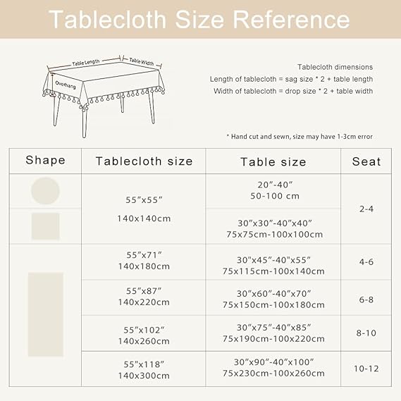 Boyut: Bu masa örtüsü 140 x 300 cm ölçülerinde, masa örtüsünün boyutunu seçerek her iki tarafta masa uzunluğunu ölçün, ardından her iki tarafta 20 ila 40 cm ekleyin