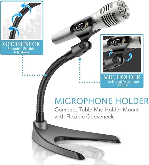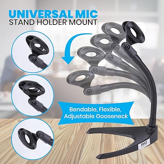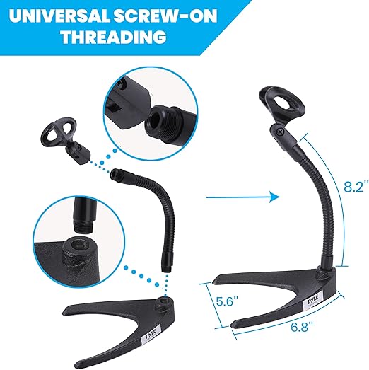 Ayarlanabi̇li̇r Kaz Boynu: Pyle masaüstü mikrofon standı 20,8 cm yüksekliğindedir. Ayar sırasında statik gürültü oluşturmaz. Sessiz ve zahmetsiz mikrofon ayarı, evrensel bir mikrofon tutucusu veya klips eki ile birlikte gelir.