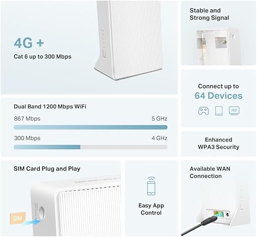4G+ Cat 6 SIM Kart ile Tak ve Çalıştır Çift Bant 1200 Mbps Wi-Fi 64 Wi-Fi Cihazına Kadar Eş Zamanlı Bağlantı Gigabit Bağlantı Noktaları