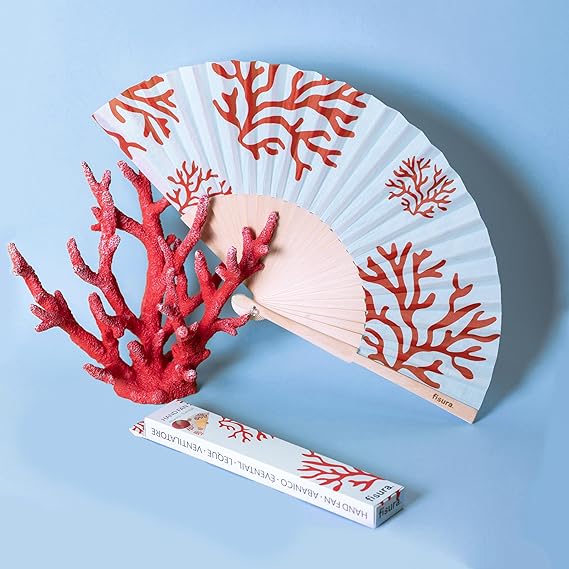 – Mercan baskılı orijinal yelpaze. Modern ve renkli ahşap yelpazeler. Mavi ve kırmızı yelpazeler. Ölçüler: 42,5 x 23 cm. Malzemeler: Ahşap ve tekstil.