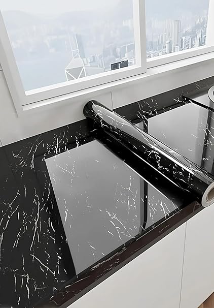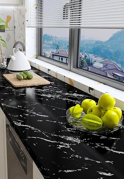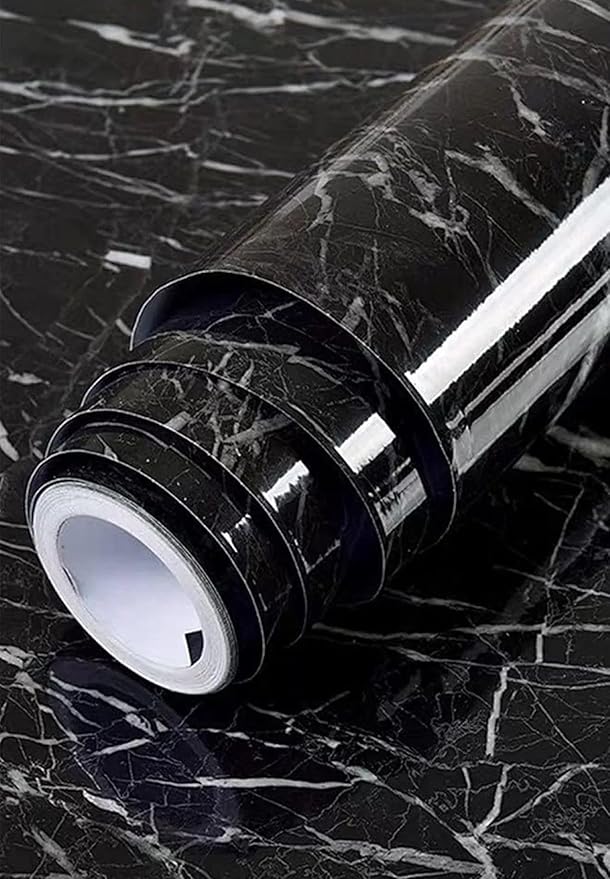 Mermer Desenli Yapışkanlı Folyo – Beyaz, 60 cm x 5 m – Mutfak Tezgahı ve Dolap Kaplama Kağıdı, Kolay Kesim ve Uygulama, Dayanıklı ve Su Geçirmez (Siyah Mermer)