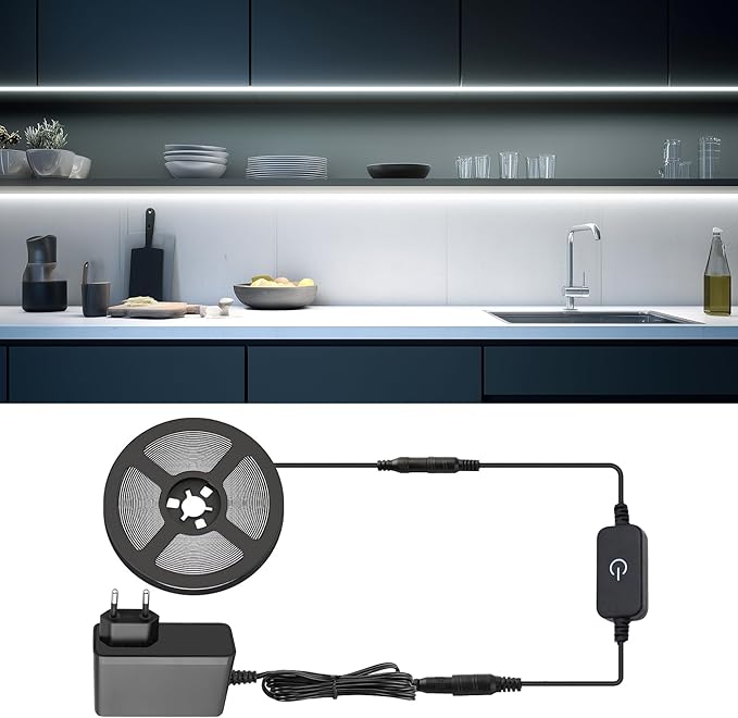 Metre Beyaz Şerit Led Dokunmatik Anahtar Tak Çalıştır Hazır Set Adaptör Dahil, Açma-Kapama, Parlaklık Ayarı Yapılabilir, Mutfak, Tezgah, Dolap içi, Ayna, Tv Ünitesi Aydınlatma