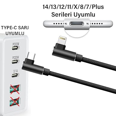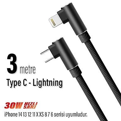 3 Metre Type c yeni nesil hızlı şarj Kablosu L Tipi 300 cm 30W’a kadar Hızlı Şarj sunar.