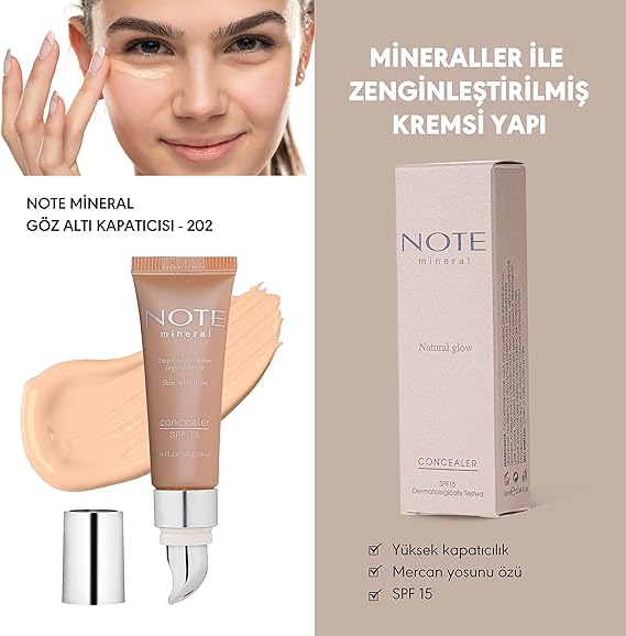 Note Mineral spf 15 Concealer 202 -10 ml Minerallerle zenginlestirilmiş özel yapisiyla renk eşitsizliği , mor halkalar ve yaşlılık izlerini gidermeye yardımcı olurken aynı zamanda hassas göz çevresine ihtiyaci olan bakmı sunarKalsiyum, demir ve vitamin metabolizmasına katkıda bulunarak cildin mat görünmesini engellemeye yardımcı olurYüksek kapatıcılığı ile göz çevresindeki koyu renk ve renk eşitsizliğini gidermeye yardımcı olurken aydınlık bir görünüm sağlar