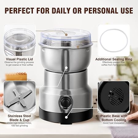【Tek Düğmeli Başlatma, Kullanımı Kolay】Taşlama işine başlamak ve düğmeyi bırakmak için AÇMA/KAPAMA düğmesine basmanız yeterlidir, taşlama anında duracaktır. * ADIMLAR: 1. Kahve çekirdeklerini öğütücüye dökün (öğütme kabının 2/3’ünü geçmeyin); Kilitlendiğinden emin olmak için kapağı sıkıca kapatın. 2. Kullanım sırasında kapak sıkıca kapatılmalıdır. 3. Çalışmaya başlamak için düğmeye basın, 10 saniye duraklatın; Gücü kesin ve tozu dökün.