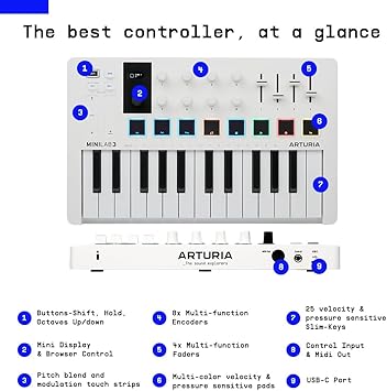 MiniLab 3 – Müzik üretimi için evrensel MIDI kontrol cihazı, hepsi bir arada yazılım paketi ile – 25 tuş, 8 çok renkli ped, beyaz