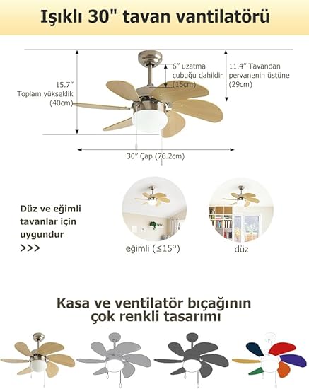 TASARIM: 76 cm Çapında, 40 cm Yüksekliğinde, 6 Kanatlı Tavan Vantilatörü, Entegre Aydınlatma Sistemi ile Modern bir Görünüm Sunar