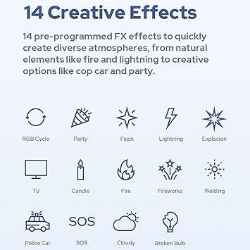 Farklı ışık efektleri: ML100RL yangın, patlama, havai fişek, kaynak, parti ve daha fazlası gibi 14 efekt ile farklı atmosferler oluşturur. Daha fazla yaratıcılık için farklı ışık efektleri arasında hızlı geçiş yapın.