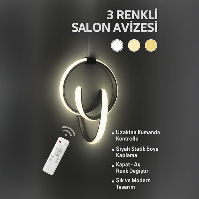 Model Taçlı LED Avize – Kumandalı 3 Renk Işık (Beyaz, Gün Işığı, Sarı), Siyah Kasa, Alüminyum Gövde, Modern Tasarım, Salon & Oturma Odası İçin Tavan Aydınlatma