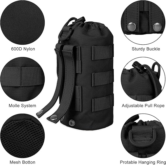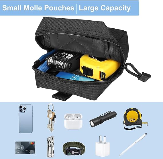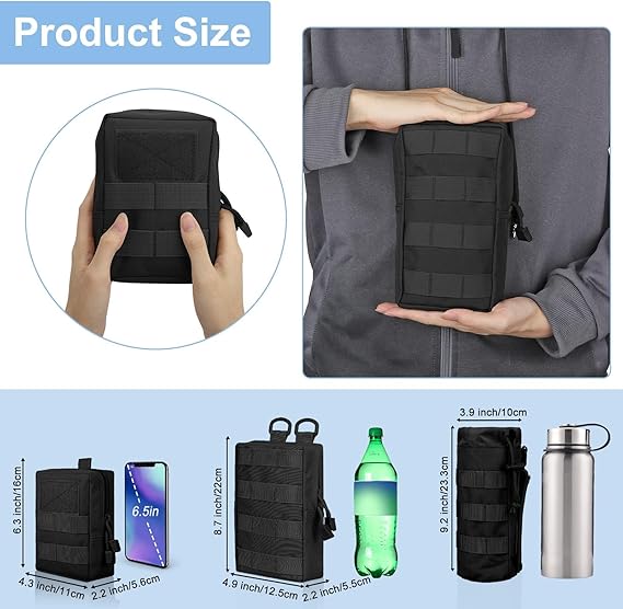 NE ELDE EDİYORSUNUZ: Paket 2 siyah taktik çanta, 1 su şişesi çantası ve 3 karabina içerir. Ölçüler: 8,7 x 4,9 x 2,2 inç (büyük), 6,3 x 4,3 x 2,2 inç (küçük), 9,2 x 3,9 inç (şişe kılıfı).