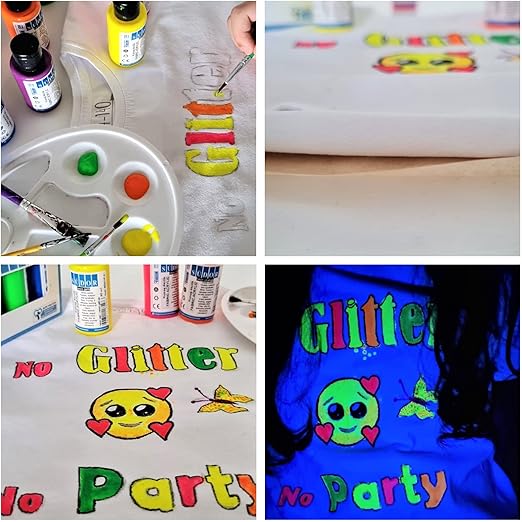 Tekstil için neon boyamızın uygulanması çok kolaydır Sadece fırça veya süngerle uygulayın ve kendin yap sanat eseriniz hazırdır Hala yeterince renkli değilseniz, parlayan boyayı iki kez uygulayın ✅ AKRİLİK ESASLI BOYALAR – Bu canlı renkler toksiktir ve gençler ve yaşlılar tarafından kullanılabilir Renkler hafif tekstil ürünlerinde özellikle opaktır ve sabitlendikten sonra kumaş üzerinde makinede yıkanabilir