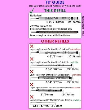 ÖNEMLİ – Sipariş vermeden önce yedek ürününüzü çıkarın ve buradaki resimlerle karşılaştırın, ardından uzunluğu ve çapı ölçün. Yedekler 4,44 inç / 113 mm uzunluğunda ve ,25 inç / 6 mm çapındadır. Yedek ürününüz resim ve boyutlarla eşleşiyorsa güvenle sipariş verin. Daha fazla ayrıntı içeren video için YouTube’da “Jaymo Rollerball Kalem Yedek Montblanc için” ifadesini aratın.