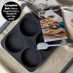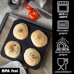 Komple set – Moritz & Moritz küçük ekmek kalıbı silikon 4 Burger Buns, Ölçüler: 26,5 x 26,5 cm, küçük ekmeklerin ölçüleri: 12 cm çap, hamur spatulası ve tarif defteri dahil