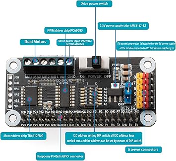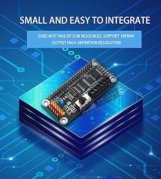 Yerleşik PCA9685 çipi, I2C iletişimi, entegre PWM sürücüsü ve bir saat, mikro denetleyicinin kaynaklarını belirlemek için sürekli sinyal göndermeye gerek yoktur. Not: Fotoğraflardaki Raspberry Pi dahil değildir.