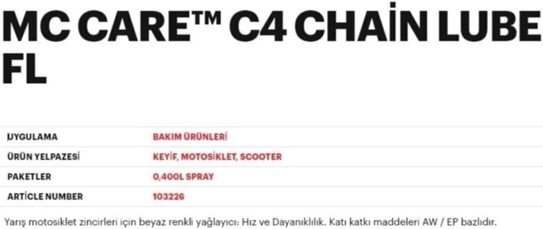 MC CARE C4 CHAIN LUBE FL (C4 MOTORSİKLET ZİNCİR YAĞI) UYGULAMA BAKIM ÜRÜNLERİ ÜRÜN YELPAZESİ KEYıf, motosiklet, scooter PAKETLER 0,400L SPRAY SERİ NUMARASI 103226 Yarış motosikletleri için beyaz renkli zincir yağı : Hız ve dayanıklılık