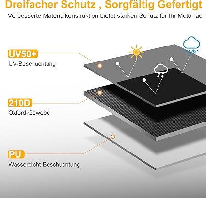 Yüksek yoğunluklu Oxford kumaş: Geliştirilmiş motosiklet brandası, sadece günlük yırtılmalara, aşınmalara ve diğer yaygın çiziklere dayanmakla kalmayıp aynı zamanda hafif olan yüksek kaliteli 210D Oxford kumaştan yapılmıştır. Böylece motosiklet kılıfı ekstra ağırlık yüklemeden kolayca taşınabilir ve kullanılabilir