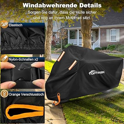 Özenli detaylar ve pratik: toptrek motosiklet brandası, düşük ışık koşullarında görünürlüğü artırmak için turuncu renkli yansıtıcı şeritlerle donatılmıştır. Kilit deliği turuncu renkli iplikle dikilmiştir, bu da metal halka ile karşılaştırıldığında pas ve aşınmayı önler ve kilitlerle uyumluluk sorunlarını çözer. Ön ve arka elastik kayış, scooter brandasının motosiklete sıkıca oturmasını ve optimum koruma sağlamasını sağlar