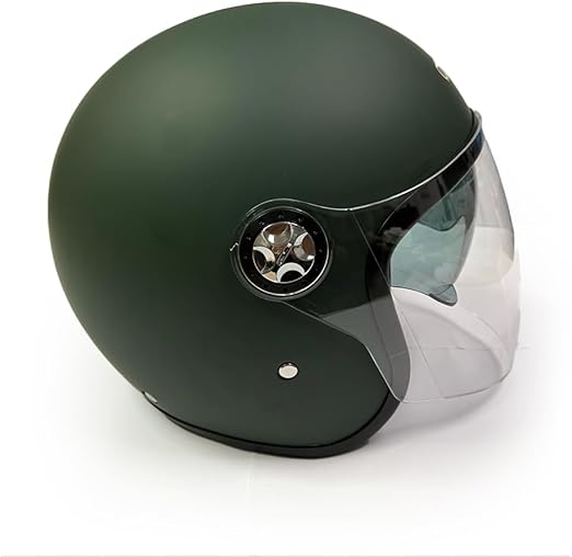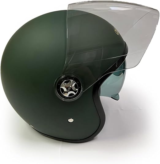 Motosiklet Yarım Kask , Mat Yeşil, Çift Vizörlü, Vintage Stil, Terletme Yapmaz Pedler