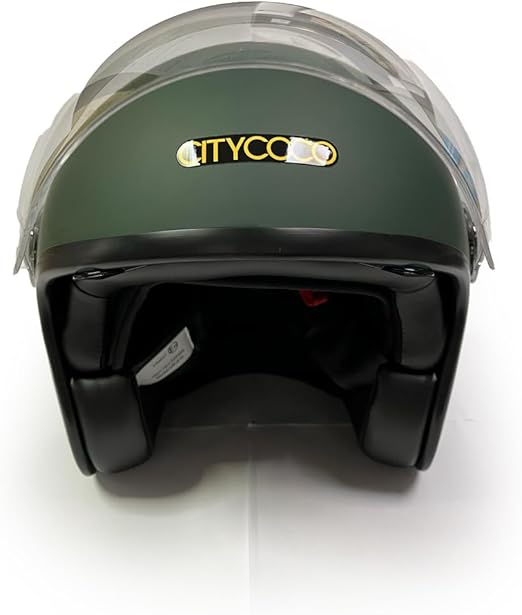 TASARIM: Mat yeşil, modern görünümlü yarım motosiklet kaskı, çift vizörlü koruyucu yapı