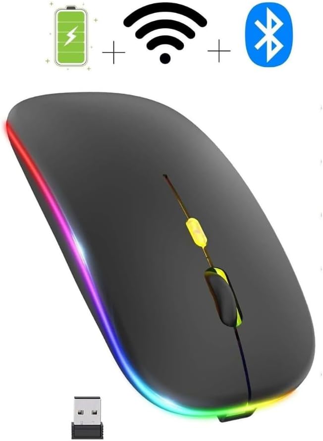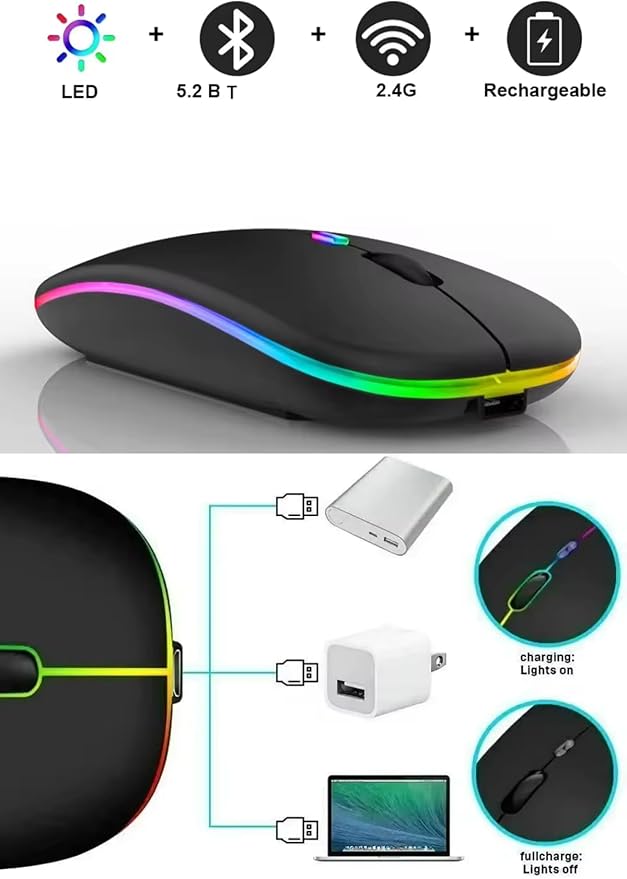 Mouse Şarjlı Wireless + Bluetooth ve DPI Ayarlı RGB Aydınlatma Işıklı ve Işıksız Kullanımlı Kablosuz Mouse