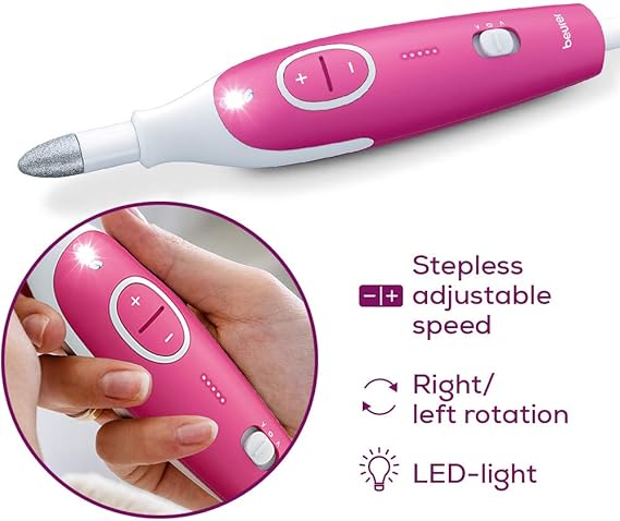 Güçlü manikür cihazı: Elektrikli manikür/pedikür seti, maksimum 4600 devir/dakika devir sayısıyla kademesiz ayarlanabilir hıza ve sağa ve sola dönüşe sahiptir
