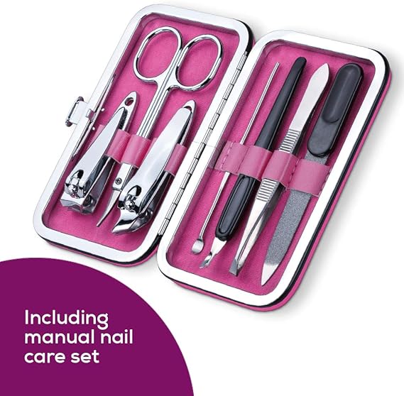 MP 44 manikür/pedikür seti, 7 başlıklı elektrikli tırnak bakım seti, LED ışık, manuel tırnak seti dahil, saklama çantalı, pembe/pembe