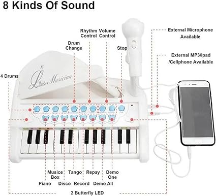 Mp3 Çalar Özellikli 24 Tuşlu Mikrofonlu Mini Piyano Jak Girişi Harici Hoparlör (Beyaz)