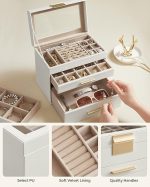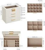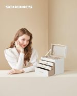 [4 seviyede saklama alanı] Aksesuarlarınızı bu mücevher kutusunda düzenli bir şekilde saklayın – küçük mücevher parçaları üstteki 3 seviyedeki farklı büyüklükteki bölmelere, güneş gözlükleri ve büyük kol saatleri alttaki büyük çekmeceye konur
